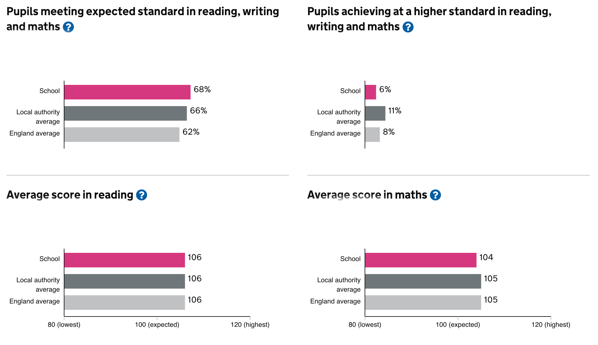 SAT’s (Standard Assessment Tests) are given at the end of Year 6. They are used to show your child’s progress compared with other children across the country. The expected scaled score for children is 100. Any child that has a scaled score of 110 or greater is judged to have greater depth in that subject.